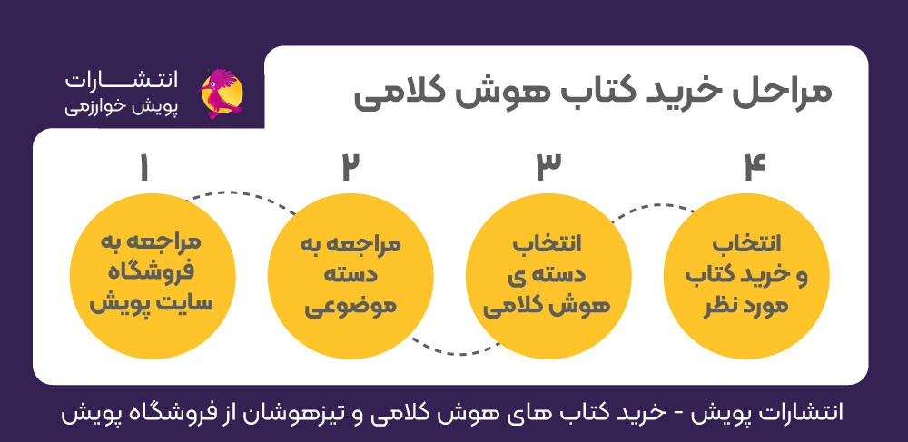 برای خرید کتاب هوش کلامی ابتدا وارد سایت انتشارات پویش به نشانی https://pooyeshbook.com/ شوید. سپس از نوار سمت راست (در نسخه دستکتاپ) و منوی بالا سمت راست (در نسخه موبایل) بر روی فروشگاه کلیک کنید. سپس از قسمت دسته بندی محصولات بر روی گزینه موضوعی کلیک کنید. در این قسمت گزینه «هوش کلامی» را پیدا کنید. در این بخش همه کتاب‌های هوش زبانی پویش به صورت یک جا در اختیار شما قرار دارد. شما می‌توانید بسته به نیازهای خود اقدام به خرید کتاب هوش کلامی کنید.