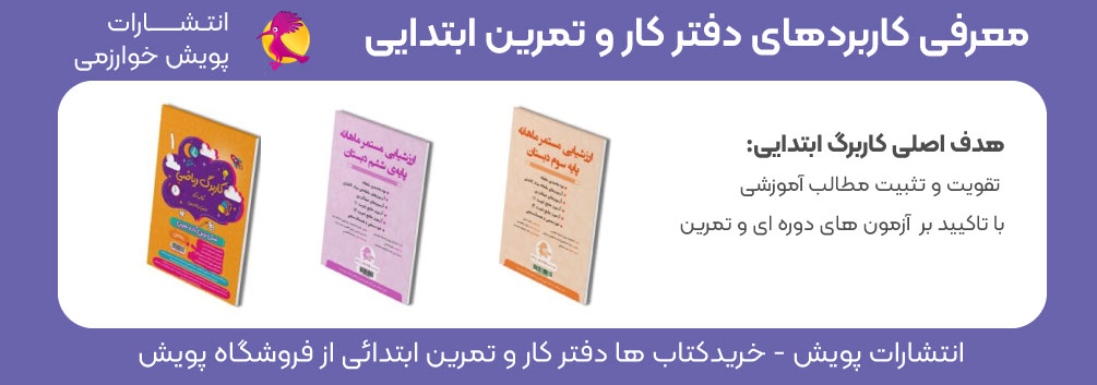 مجموعه کاربرگ ابتدایی پویش منبع معتبر و عالی برای سنجش کیفیت آموزش است. کاربرگ آموزشی پویش بازخوردهای بسیار مثبتی از دانش آموزان و معلمان دریافت کرده است. با توجه به کیفیت چاپ، طراحی و محتوای کاربرگ های تمرین پویش می توان گفت که قیمت کاربرگ ابتدایی پویش یکی از بهترین های موجود در بازار می باشد. این کتاب ها توسط کارشناسان صاحب نام و با تجربه در زمینه آموزش ابتدایی به رشته تحریر در آمده است. و به دانش آموزان برای موفقیت در آزمون های پایان ترم و میان ترم مدرسه کمک می کند.